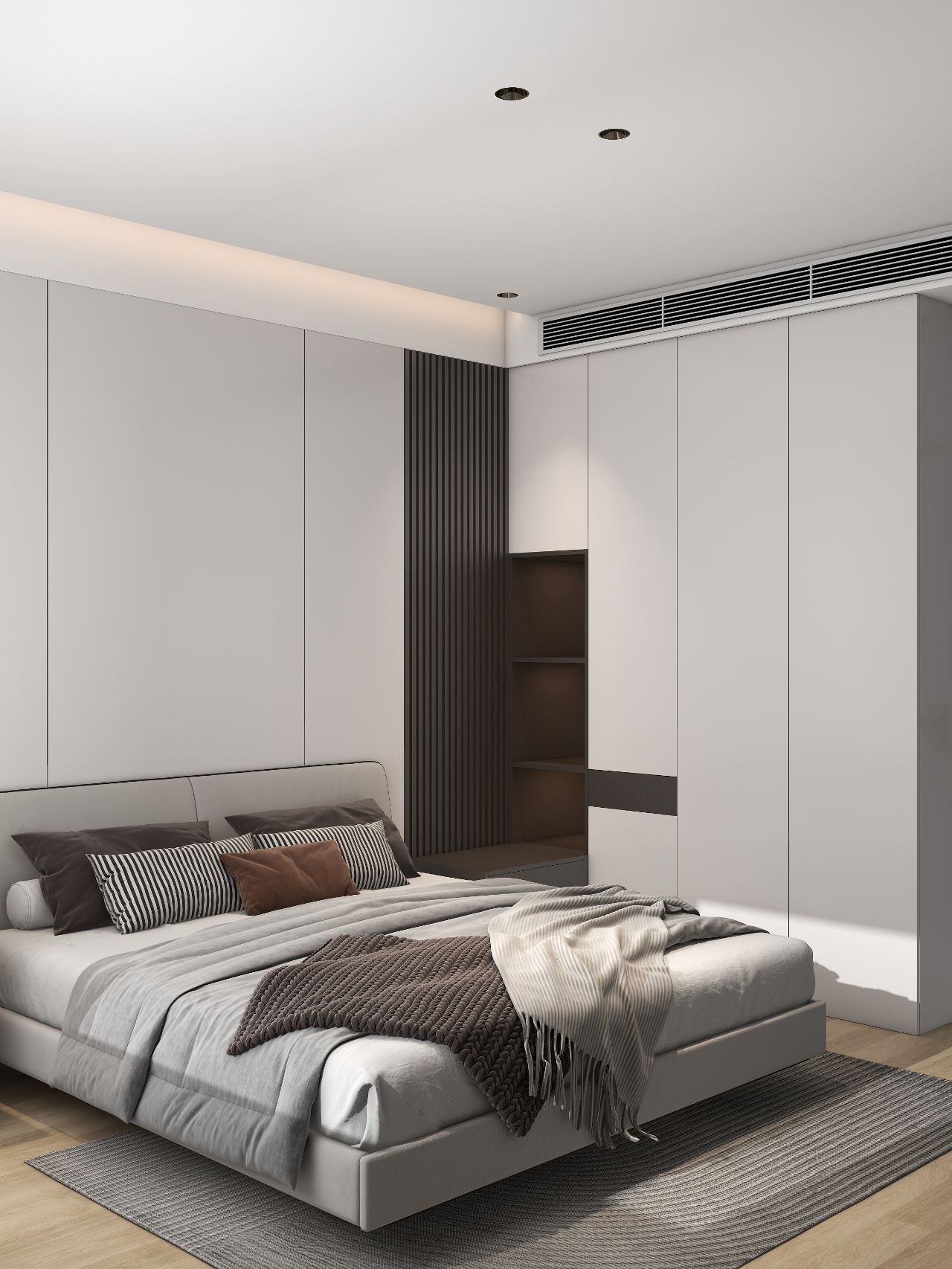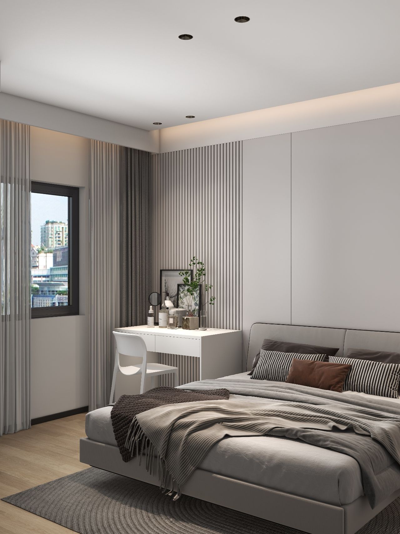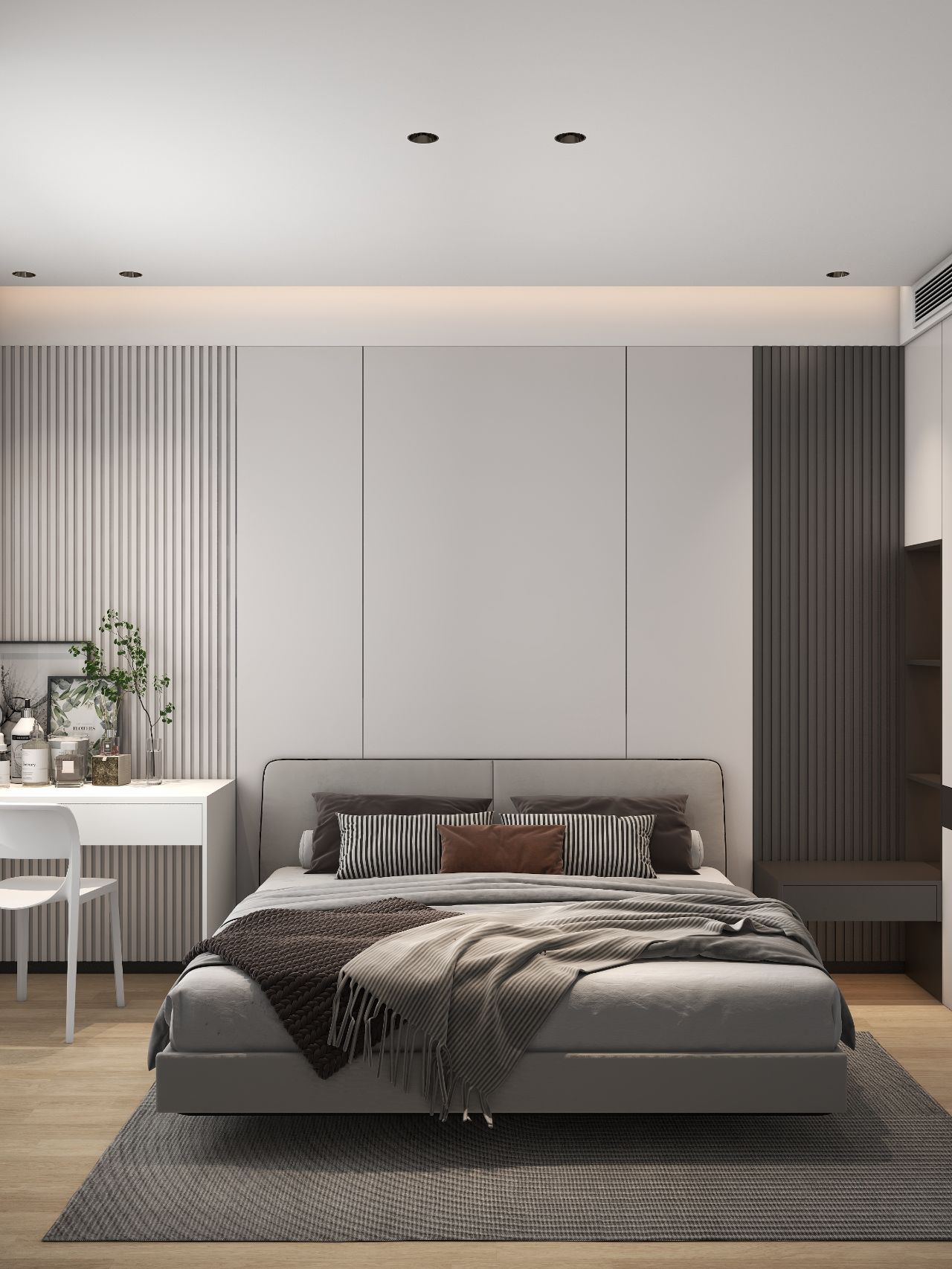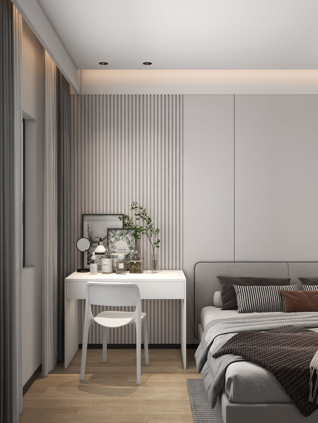 護墻板床頭背景墻,左邊床頭柜改梳妝臺,無主燈設計,實用又高級。