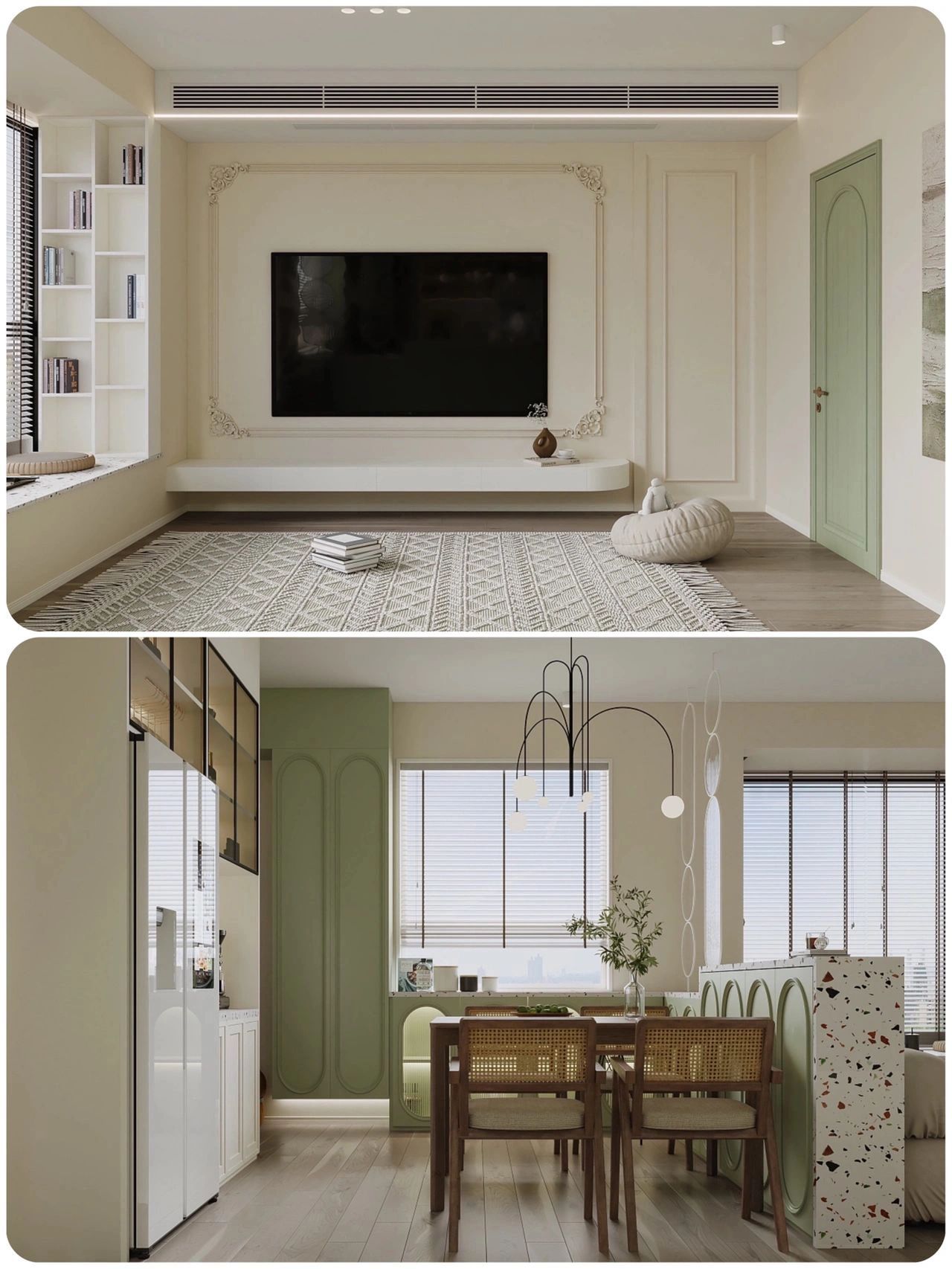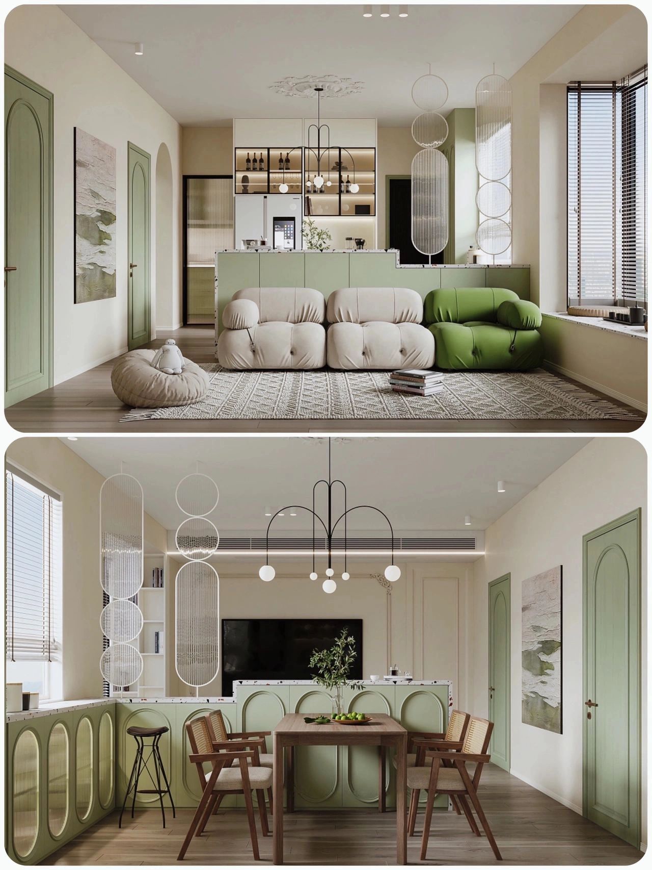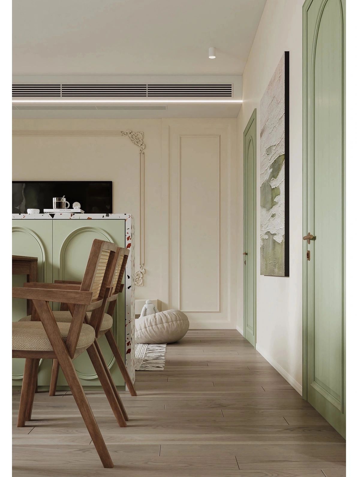 在全屋綠色的鋪陳下,用法式石膏線做裝飾,再加上混搭的現(xiàn)代&復(fù)古家居,清新自然又復(fù)古高級(jí)~
