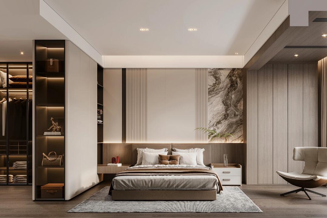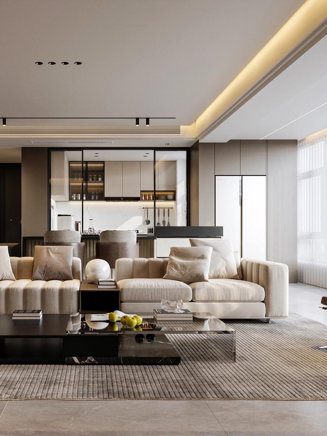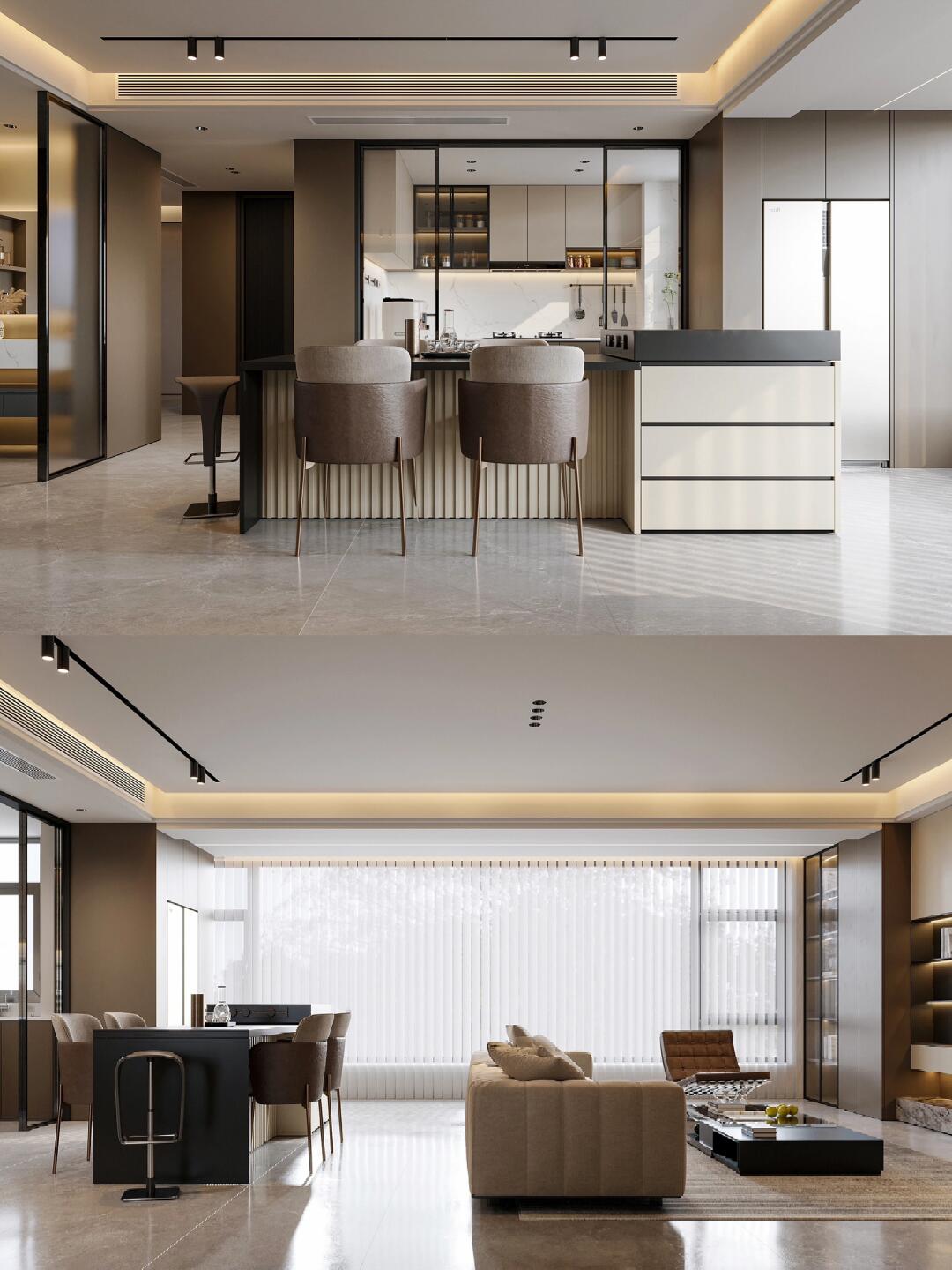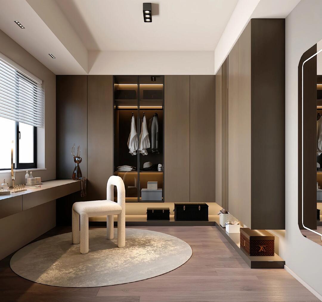 本案整體以意式輕奢風為主,強調空間的通透與舒適感,色調上以暖咖系為主基調,