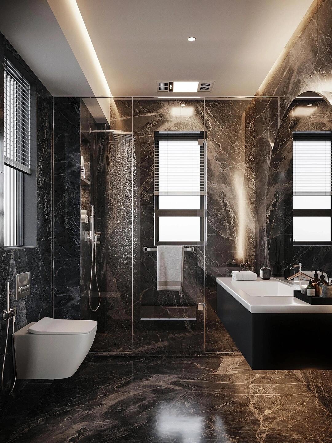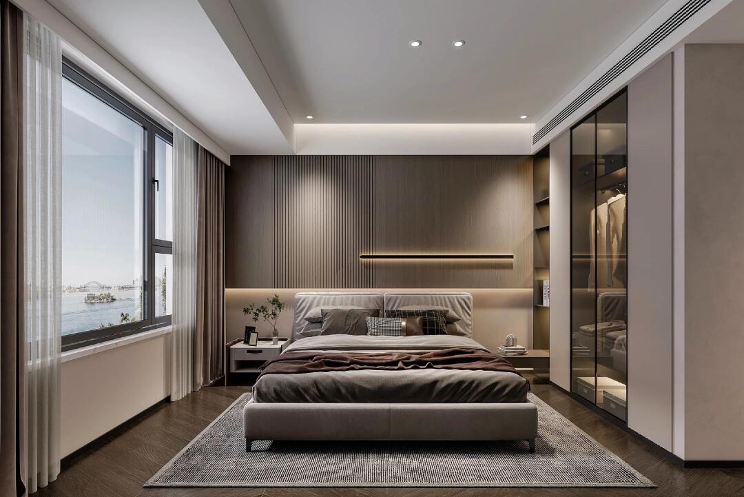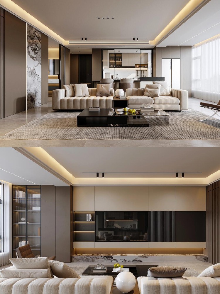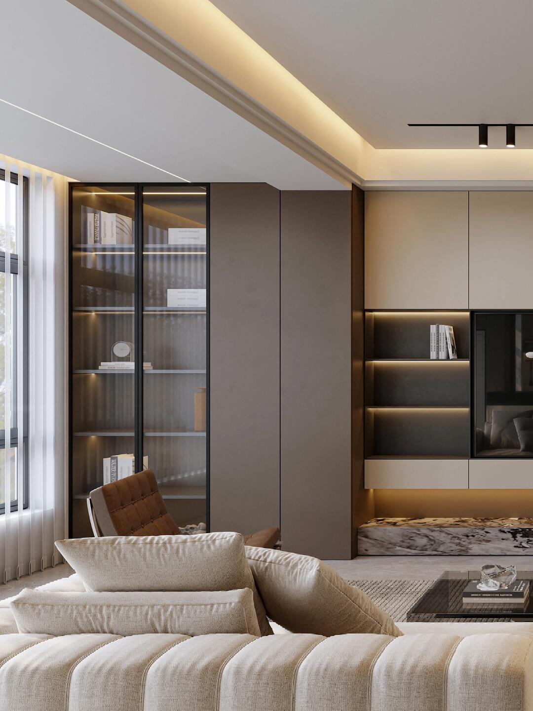 本案整體以意式輕奢風為主,強調空間的通透與舒適感,色調上以暖咖系為主基調,