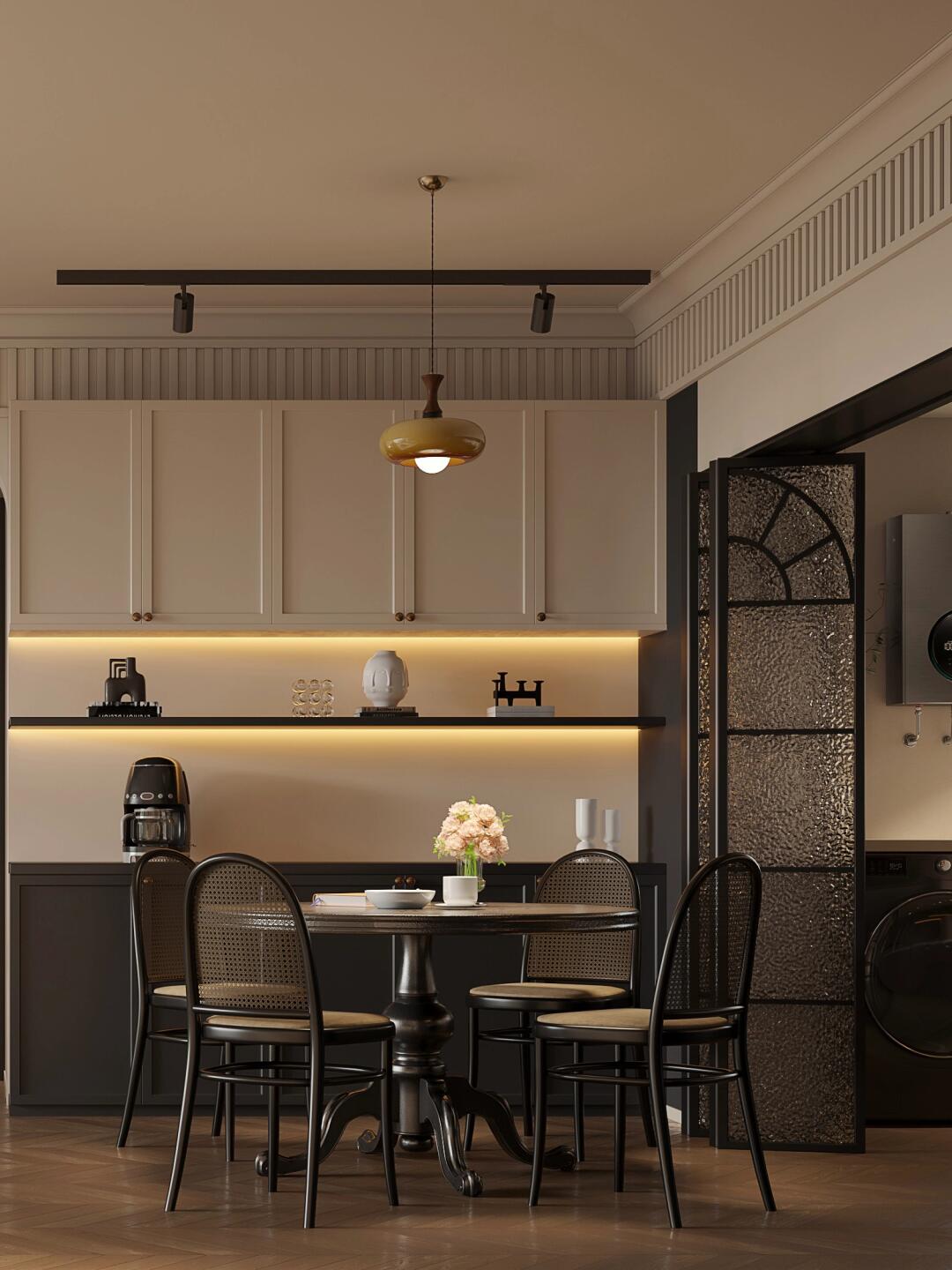 軟裝及主材以胡桃木色和黑色為主,餐廳和廚房相連,合二為一 也可合一為二,