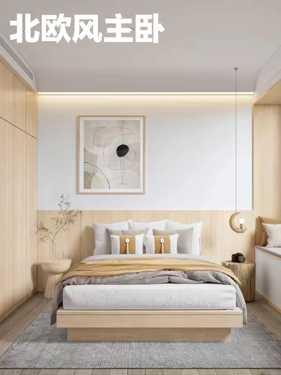 臥室:實木地板通鋪,讓臥室更統一、更舒適,床頭背景板采用清水模板材,淡雅樸實,營造安穩低調的睡眠氛圍,同時散發懷舊風情。