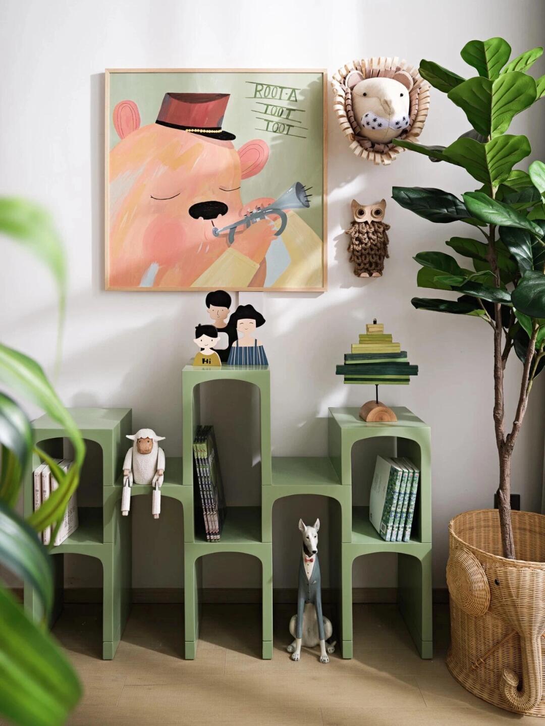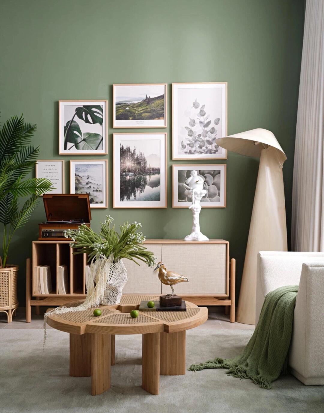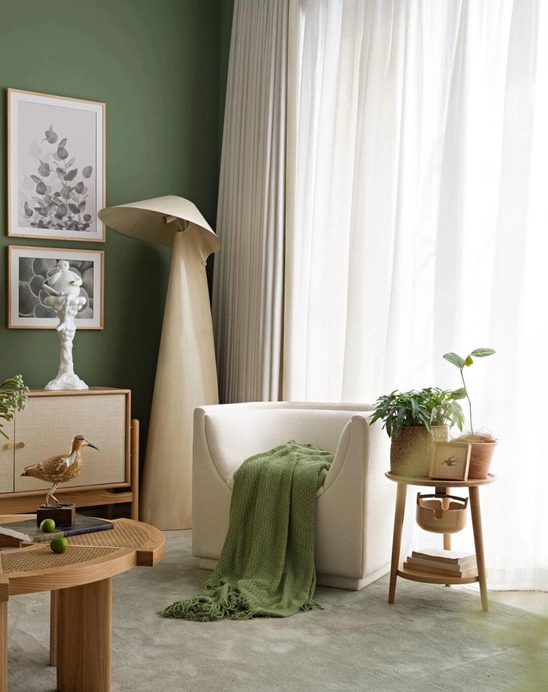 在客廳空間內布局了大量的綠色家具、物件,墻壁的顏色也選用森林綠,
