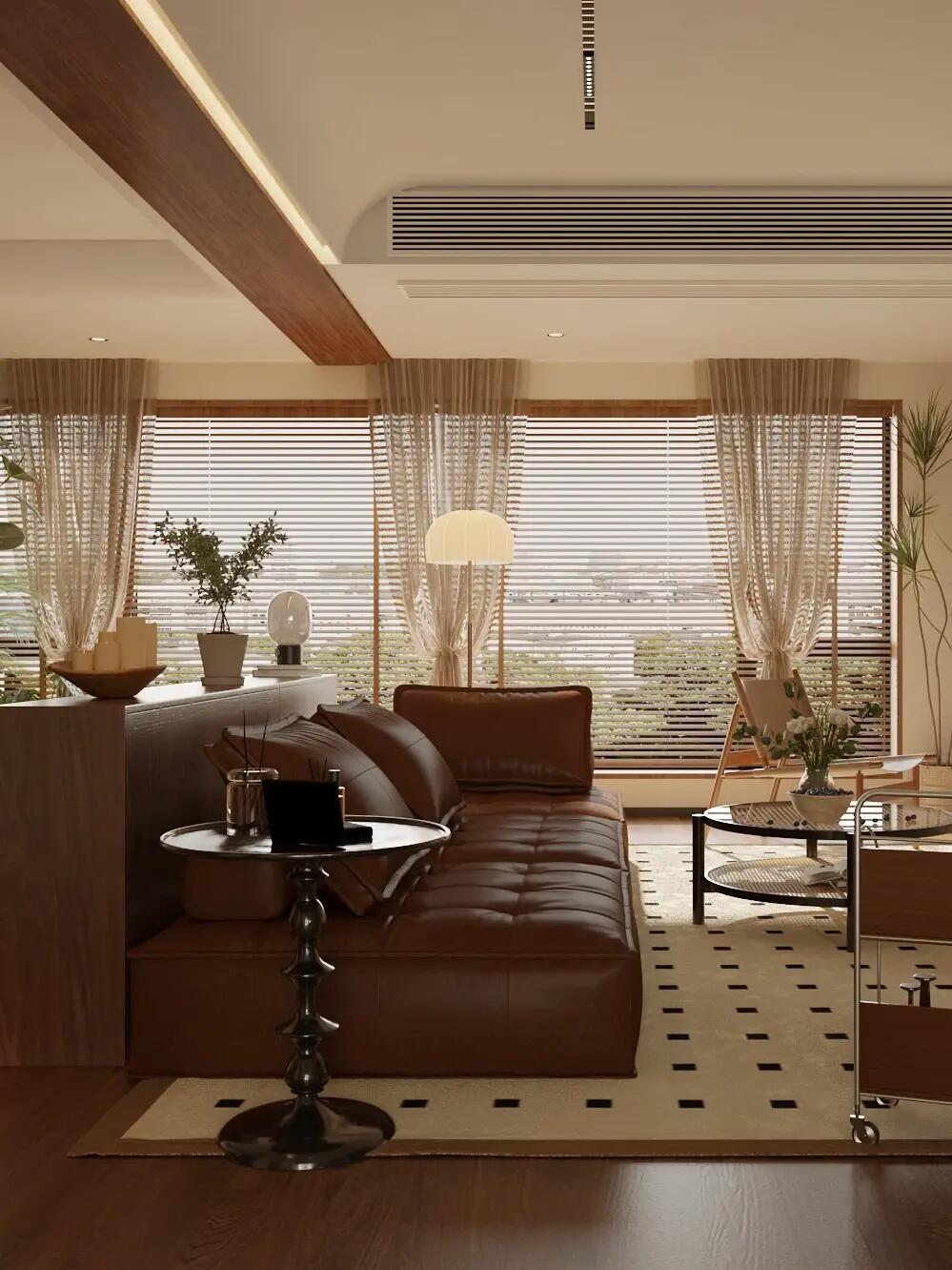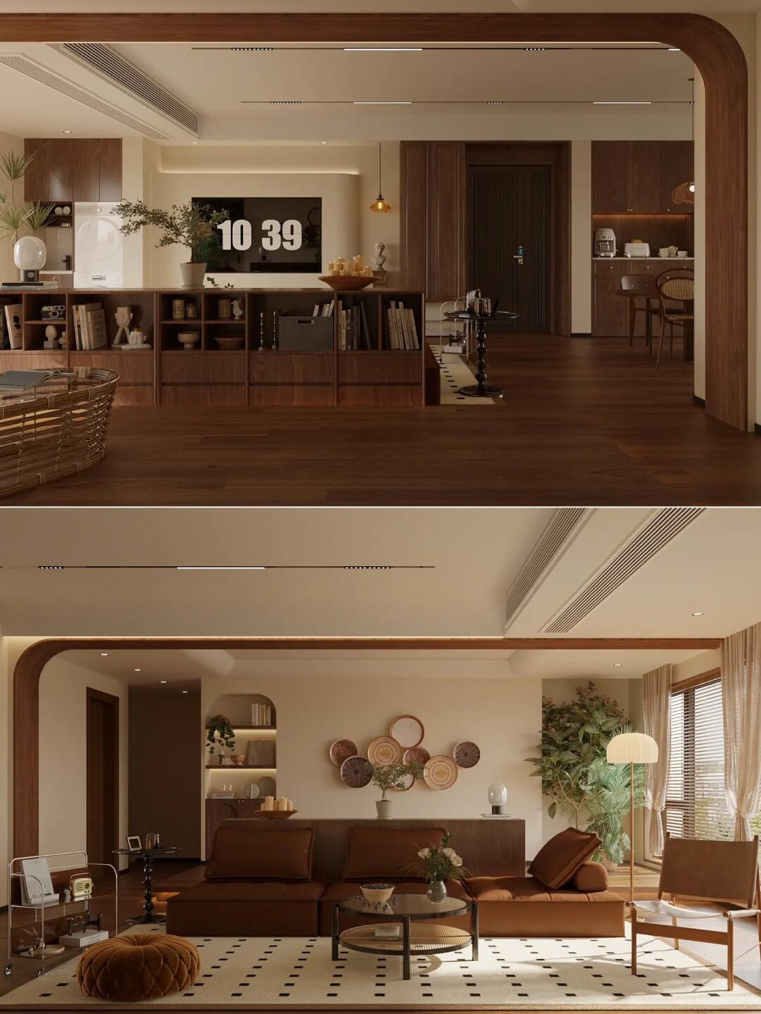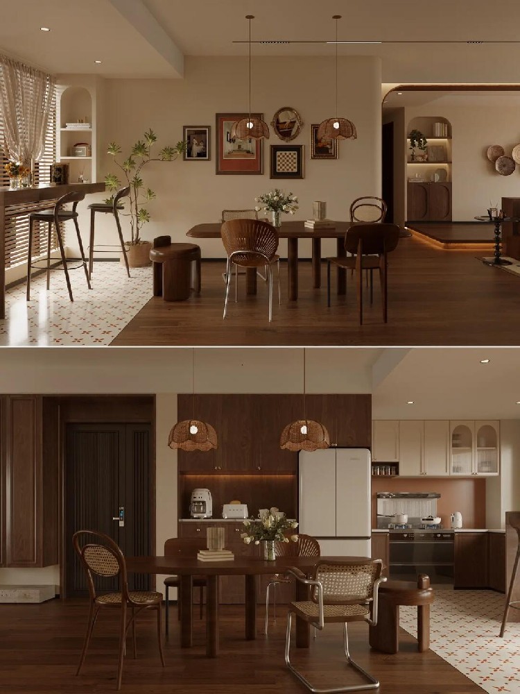全屋通鋪咖棕色的木紋磚,搭配同色系家具,塑造了格調滿滿的美式復古感