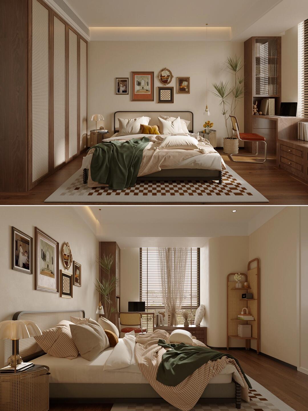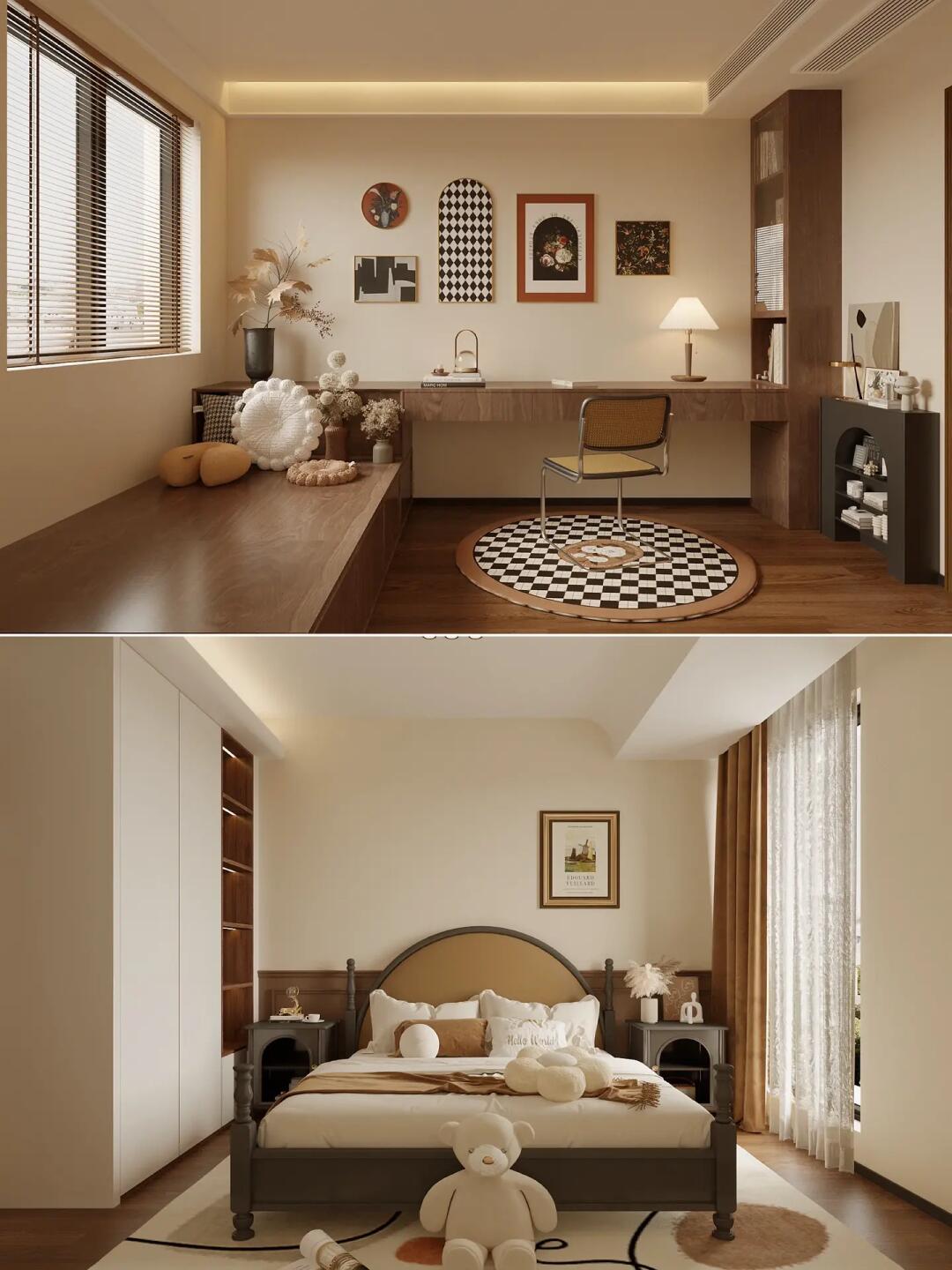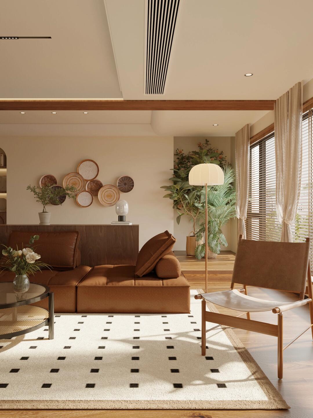 全屋通鋪咖棕色的木紋磚,搭配同色系家具,塑造了格調滿滿的美式復古感