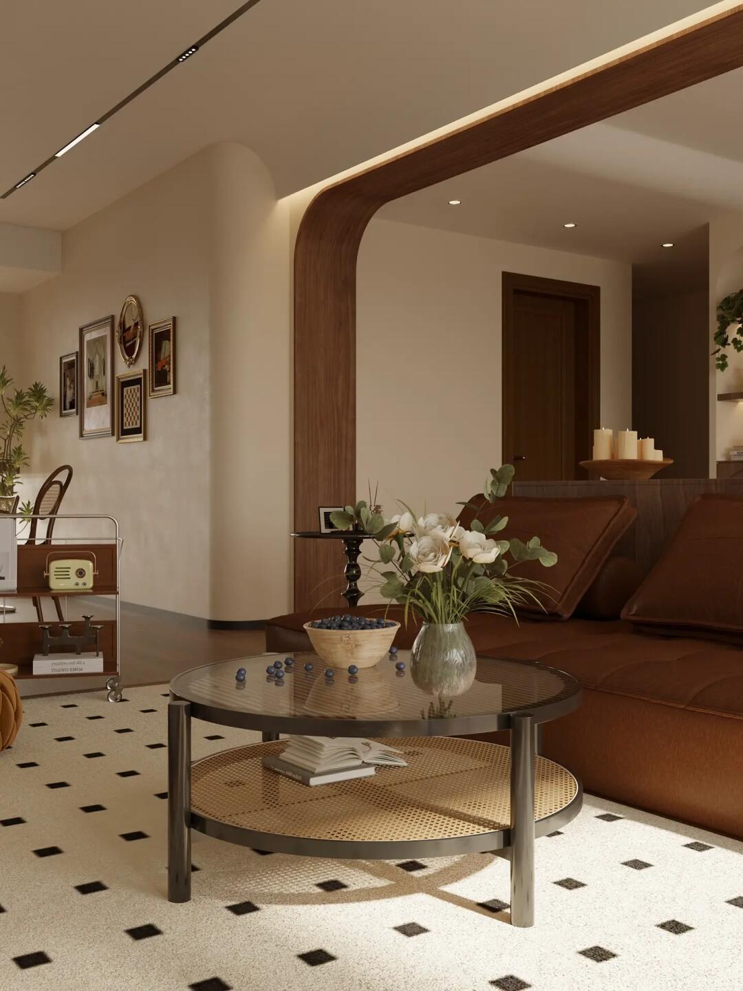 衍生至墻面,劃分空間布局的同時又打破了無主燈吊頂的現代感,再加上局部弧形造型點綴,復古格調感滿滿