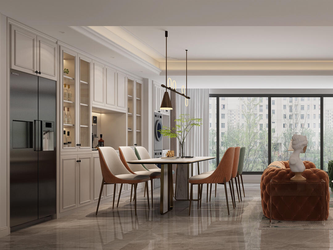 奶白色的大理石餐桌,搭配上幾把皮質座椅,