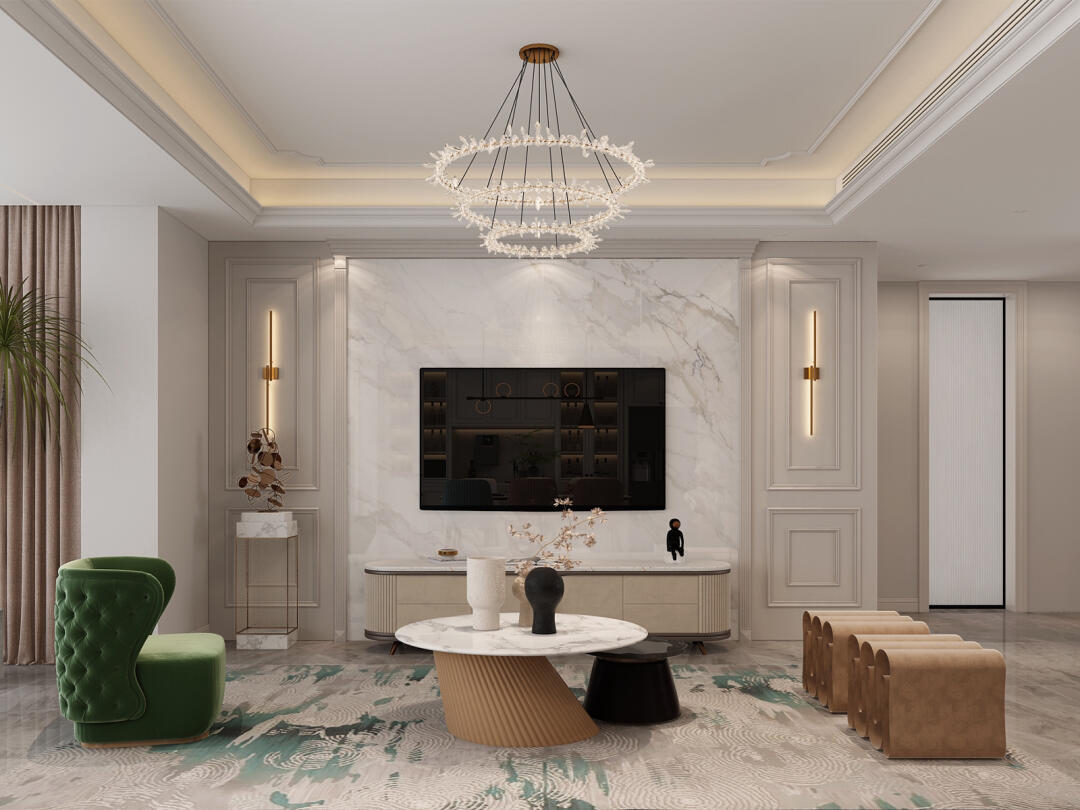 客廳我們用了吊燈和燈帶還有射燈加自然光線,營造了溫暖的空間氣息。