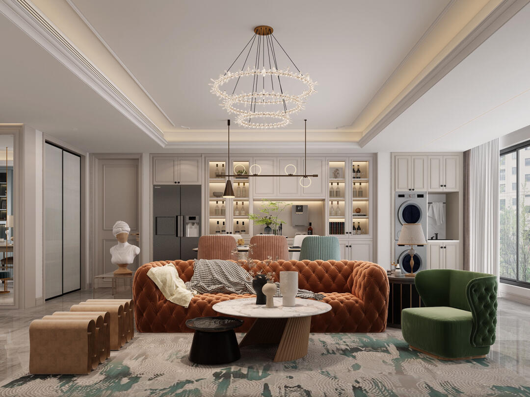 藏綠色的地毯,搭配咖色的沙發,為了營造美式輕奢之風,