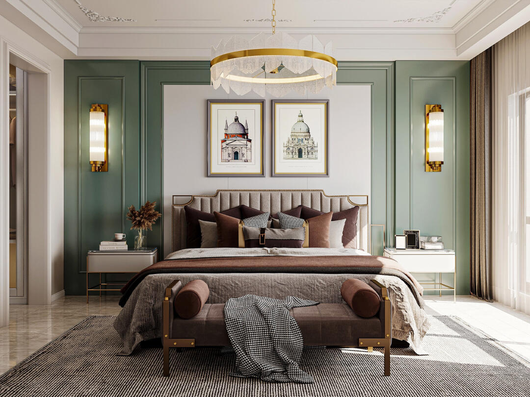 綠色的背景墻,搭配壁燈裝飾,讓整個空間搭配時尚又不缺層次感,