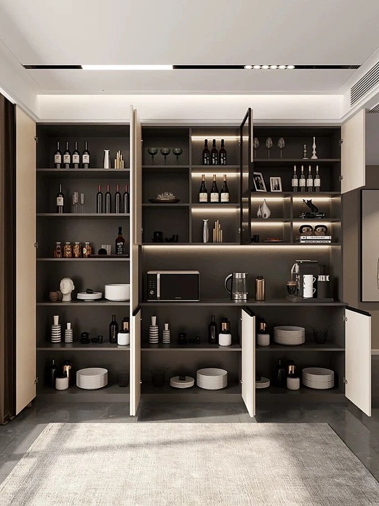 ?收納高柜、玻璃柜、薄吊柜、置物等的多功能設(shè)計(jì),分區(qū)功能更實(shí)用、有藏有露更高級