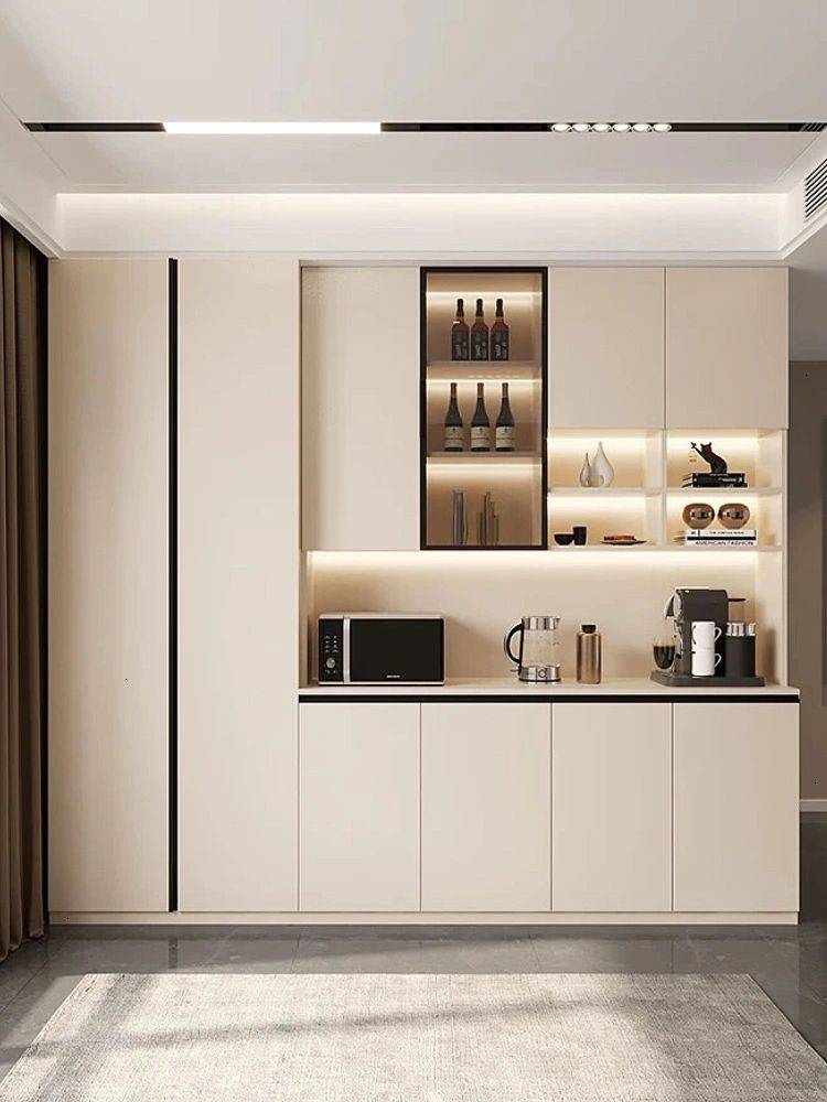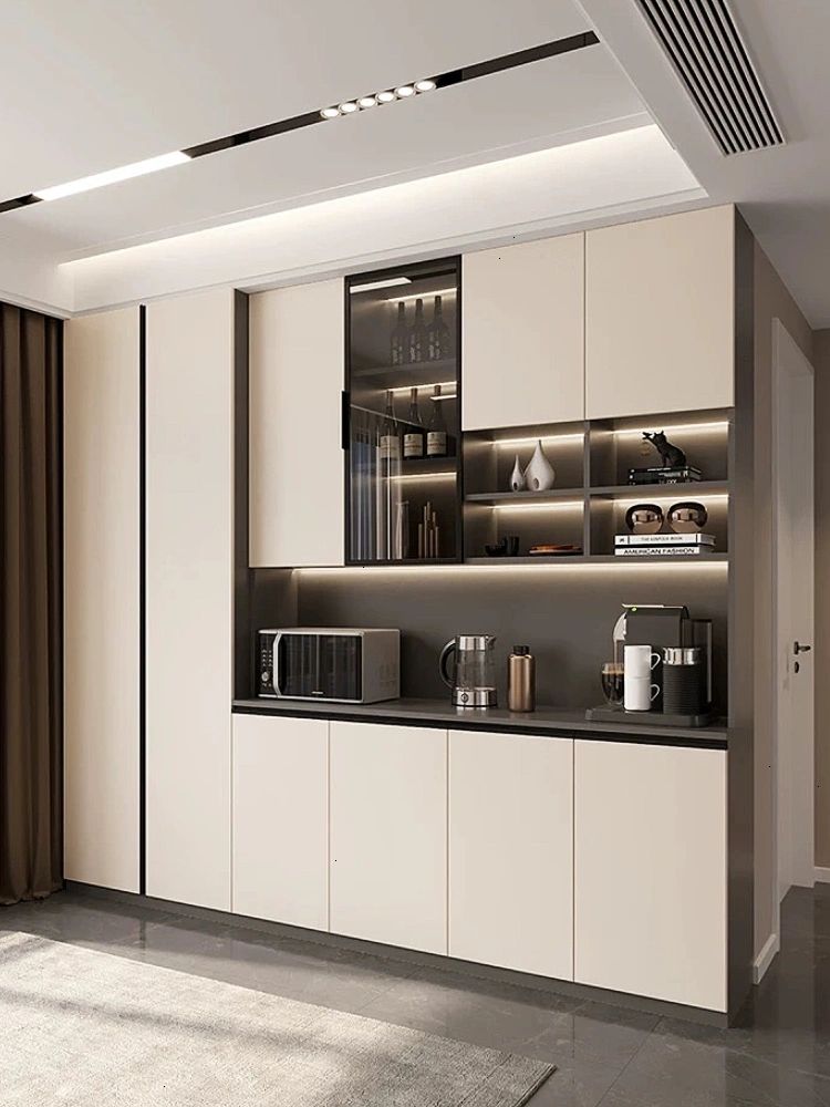 ?餐邊柜做極簡造型,一體成型的隱形設(shè)計(jì)再搭配上嵌入式燈帶,時尚且高級
