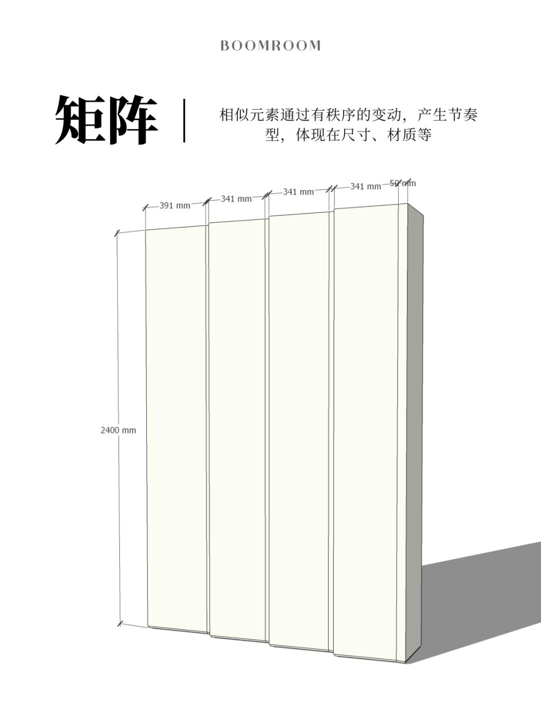 在空間內進行互相交錯的設計,在視覺上增加層次感,制造多元的變化狀態 · ??設計手法②:圍合 在柜體的視覺空間上營造進退關系,通過留白的方式做跳色,突出重點。 · ??設計手法③:進退 營造空間體塊的進退,增加空間層次感。 · ??設計手法④:疊級 通過不同層次的疊加和交錯,營造出獨特的視覺效果和空間韻律 · ??設計手法⑤:穿插 將較小的剖面穿插進柜體打破常規布局,形成視覺沖擊力 · ??設計手法⑥:懸挑 通過柜體和墻體懸空,打造一種漂浮感 · ??設計手法⑦:離縫 在相鄰材料或體塊之間留出一定寬度的縫隙,增加層次感 · ??設計手法⑧:夾吊 用不同的材質、體塊打破平面的秩序,從而創造出新的視覺焦點 · ??設計手法⑨:矩陣 相似元素通過有秩序的變動,產生節奏型,體現在尺寸、材質等 · ??設計手法⑩:咬合 將不同的體塊進行組合,以創造出更豐富、有層次的視覺效果