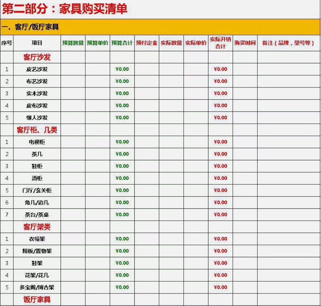 對了!除了需要知道上面裝修的基本流程外,裝修新手更需要一份新房裝修預算表!