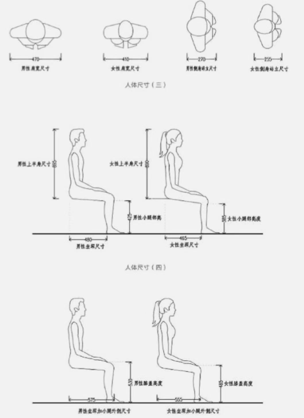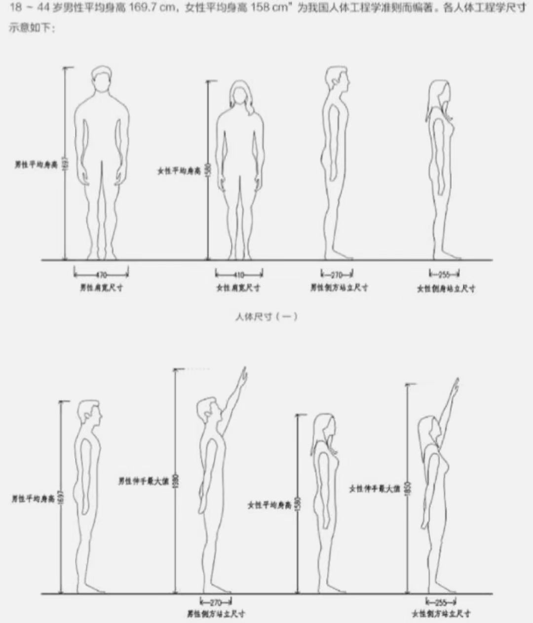在我國的人體工程學(xué)尺寸中,以男性平均身高169.7cm,女性平均身高158cm為基準(zhǔn),延伸出人體的標(biāo)準(zhǔn)肩寬、伸手最大值、坐深、膝高等數(shù)值,如下圖: